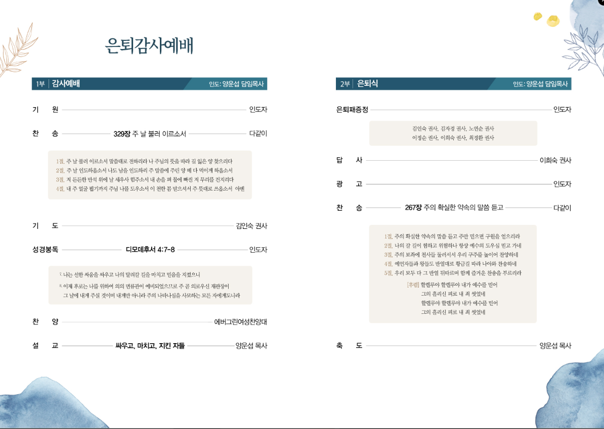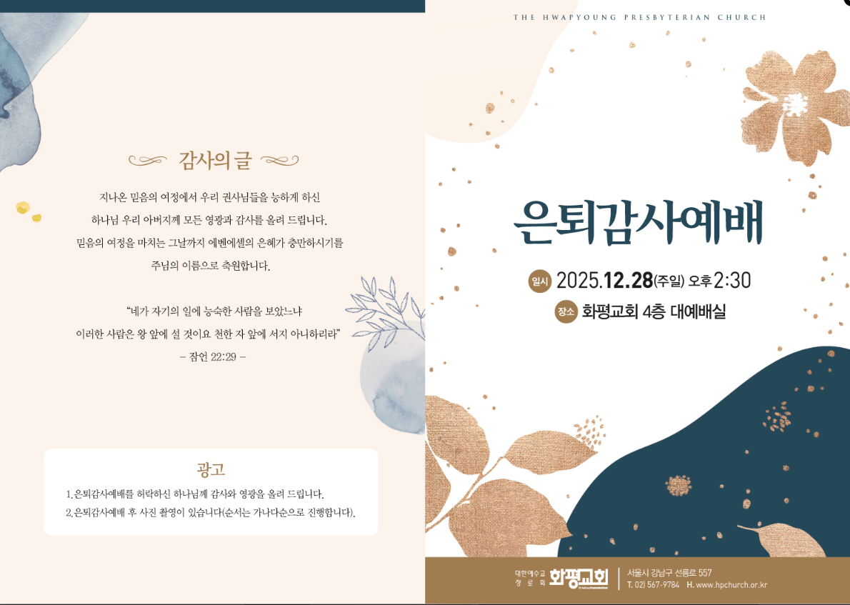 | - | 2025 제직 은퇴감사예배 | 화평교회 | 2025-12-31 |