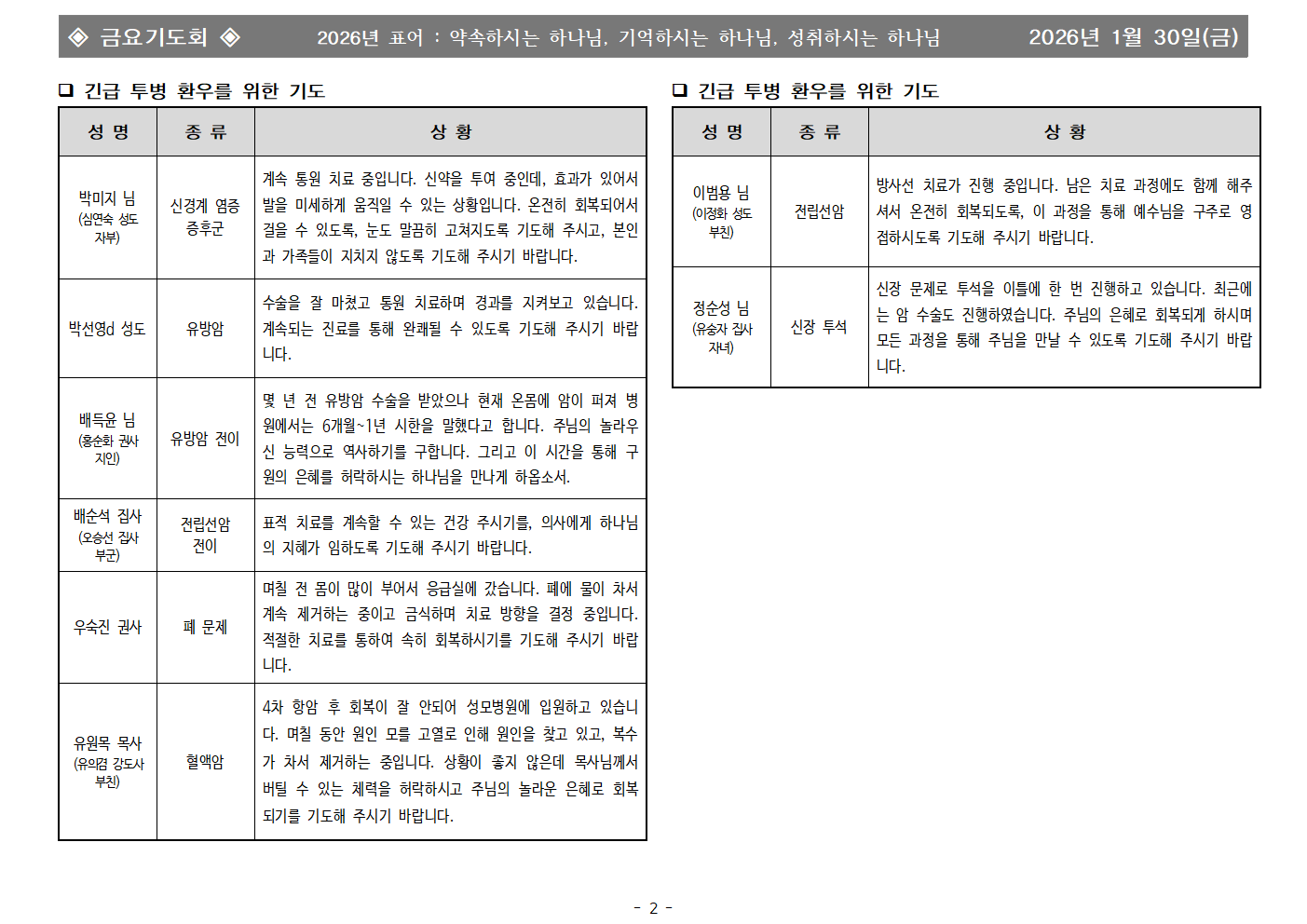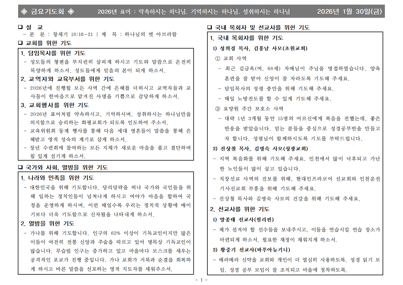 | - | 2026년 1월 30일 금요기도회 합심기도 | 화평교회 | 2026-01-30 |