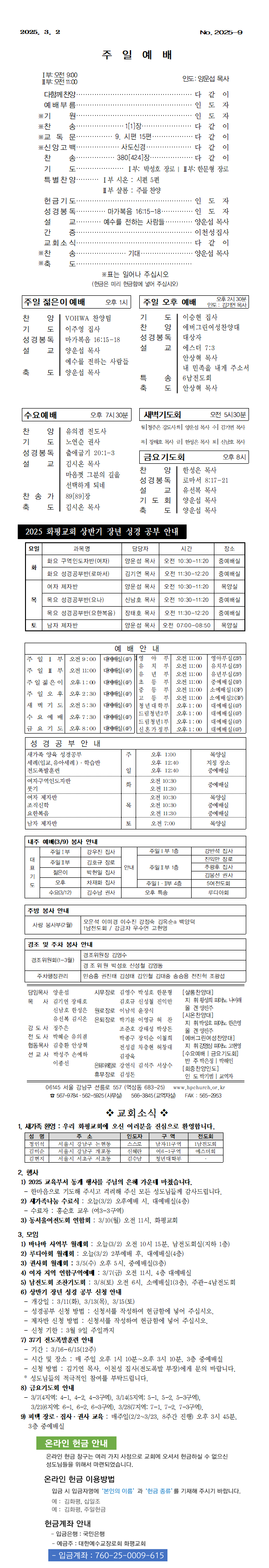 | 이전 | 2025년 3월 9일 주보 | 화평교회 | 2025-03-08 |